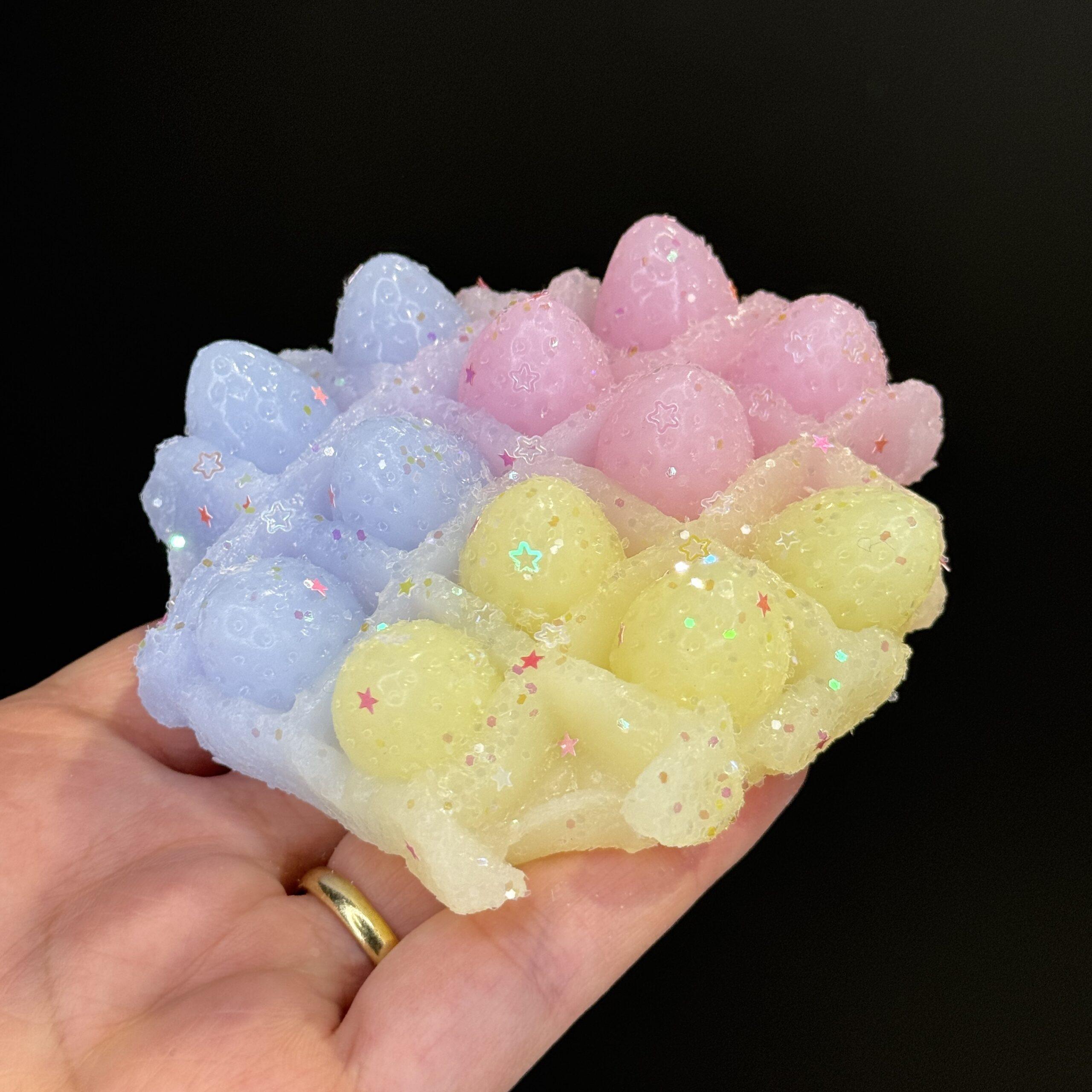 Each squishy is lovingly handmade, so no two are exactly alike. Whether you’re collecting kawaii squishies or need a relaxing desk toy, this waffle-strawberry combo brings charm, sparkle, and a gentle tactile experience into your daily routine.